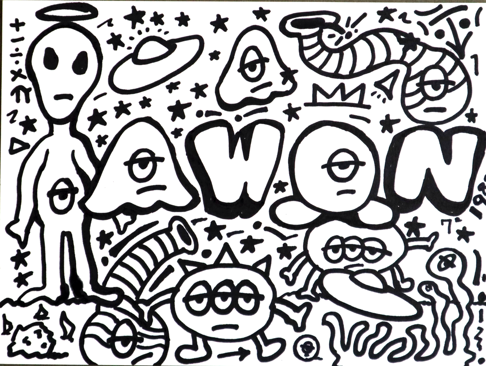 Awon is known for his jazzy, soulful, 90s nostalgic style of Hip Hop, while his art is impelled by his upbringing during the 80s in New York City. Inspired by Keith Haring, Basquiat, and Dondi White, Awon has a style of art that resembles the jumbled tags on the inside of New York City train cars.